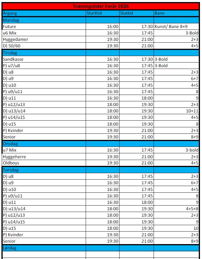 Forårs træningstider for 2026